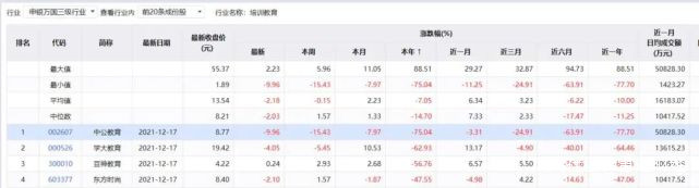 截至12月17日,中公教育為2021年以來A股培訓教育行業中跌幅最大的公司,年內跌幅達75.04%。當前市值較年內最高點蒸發近2111.10億元。