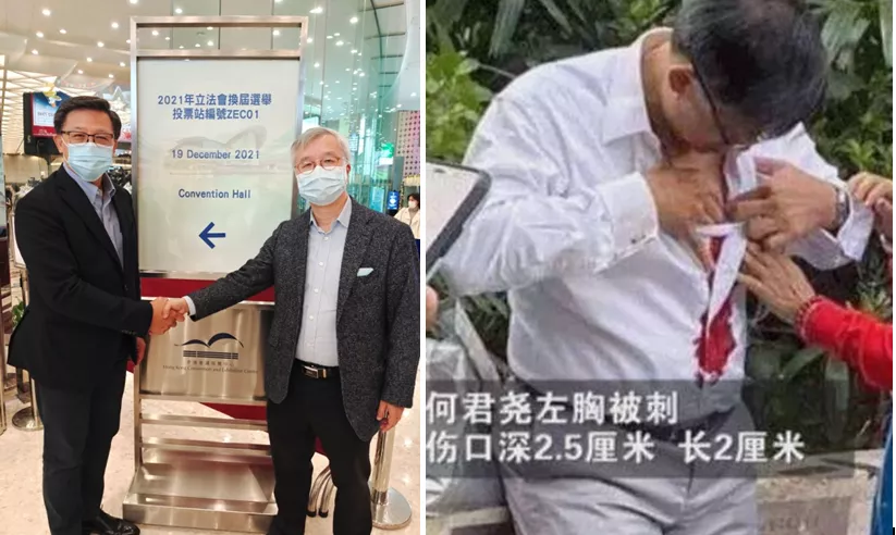 這張組圖,右邊部分,是2019年11月,香港區議會選舉期間,立法會議員何君堯在屯門湖翠路街頭宣傳期間,一名身穿藍色衣服的男子手捧鮮花靠近何君堯,和他聊天分散注意力,突然從書包裏掏出尖刀刺向何君堯,留下一條2釐米長,2.5釐米深的傷口。