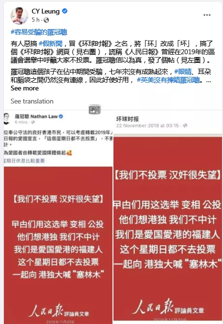 今天,香港前特首梁振英在社交媒體上公開了竄逃英國的“反中亂港”頭目羅冠聰的一條推文,梁介紹説,有人惡搞假新聞,冒《環球時報》之名,將“環”改成“壞”,換了個“壞球時報”網頁,謊稱“人民日報”曾經在2019年香港區議會選舉中呼籲大家不要投票。羅冠聰信以為真,發了個貼。