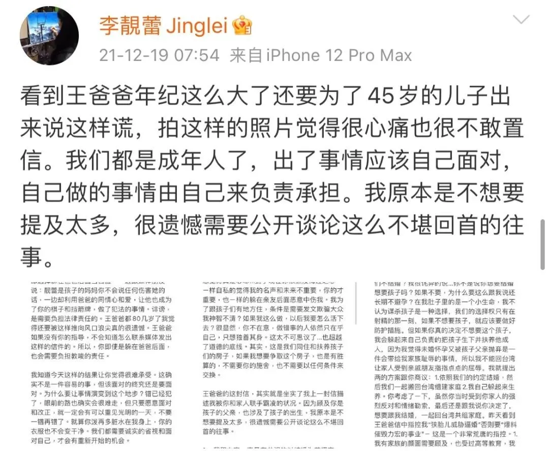 第二説到兒子的婚姻,竟是七年的痛苦,“這個婚姻從頭就是千瘡百孔,力宏勞心勞力,補東補西來維繫婚姻。”看到這句,又很困惑,怎麼回事?李靚蕾發文反駁説,“如果是七年的痛苦,怎麼會有二胎跟三胎?沒有恩愛,如何會有孩子?”