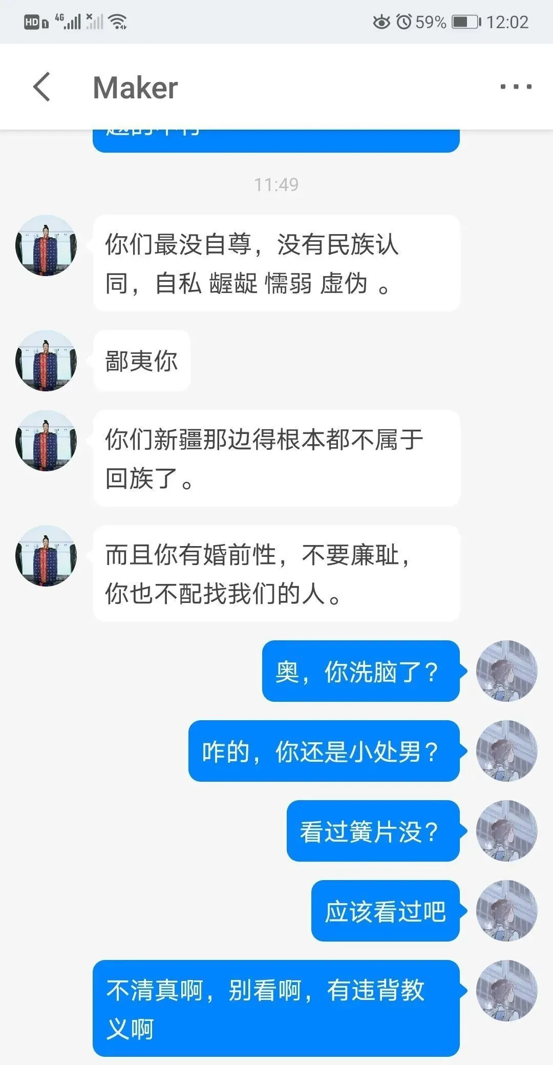 已經有人開始看不慣我,私信罵我了,哈哈哈哈……我覺得好搞笑啊,你信仰你的關我什麼事,你裹腦裹得太嚴重了吧,我説的只是我身上及周邊的人的事,跟你有啥關係啊,咋的難不成你也幹過這種事啊。討厭自己民族怎麼了,我就是討厭她們一天閒的沒事聚一起倒閒話,倒就倒吧還熱衷於 哎誰家丫頭那麼大了還上學,都不回家做飯。哎,誰家生了個女兒,沒兒子。哎,誰家孩子出去上學一天畫的跟個妖怪一樣等等,在我看來,這就是嫉妒!別人過上了自己曾經想要的生活,自己還在自我掙扎卻又改變不了又不想改變,只能詆譭,我討厭大人嘴巴口中你們結婚丫頭彩禮多少多少互相比較,感覺女兒就是貨物,我討厭一天那些男的當了XX立牌坊,一天把教義掛嘴邊,出去抽煙喝酒嫖賭樣樣都佔,你但凡説是裏外一致我都敬你,在這罵我,你要是正兒八經的清真人,你趕緊把你手機扔了別玩了,畢竟不是msl研發的,不清真,還在這給我嘰嘰歪歪?你撒泡尿照照你自己,頑固封建又自我滿足的人。一天天給你能的,你信教,古蘭經裏不是説不能論人是非麼,你在那罵我,你做到了嗎?辣雞,啊呸!