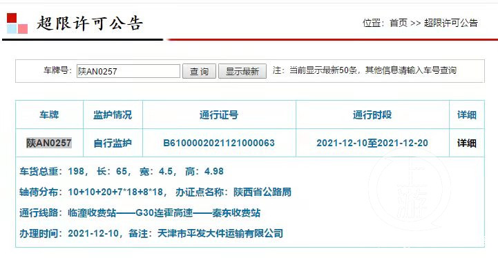 上游新聞記者在相關網站上反覆查詢後看到,該車只辦了一張超限許可證。12月10日在陝西省公路局辦理的超限許可顯示,監護方式為自行監護,通行路線為“臨潼收費站—G30連霍高速—秦東收費站”,通行時段為2021年12月10日至2021年12月20日。車貨總重198噸,長65米,寬4.5米,高4.98米。系天津市平發大件運輸有限公司車輛。其所運貨物為換熱器油箱,貨物重量為184噸。