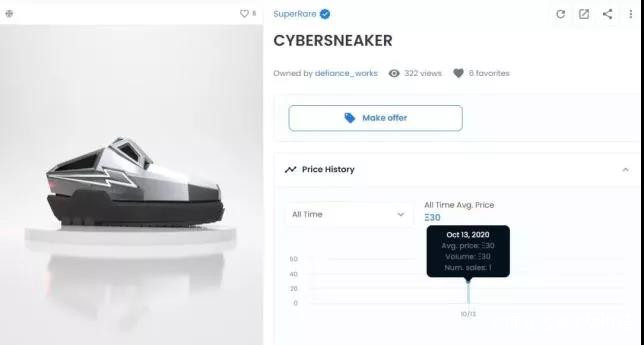 此舉引發的轟動也成功讓RTFKT從幕後來到台前。2020年下半年知名NFT交易平台OpenSea的數據顯示,這款球鞋最後一次成交的價格為30ETH,根據當時的兑換率來計算,大概這款虛擬球鞋的成交價約為1.8萬美元左右,而最高的時候,這款鞋在網絡上報價超過70ETH,也就是差不多5萬美元。