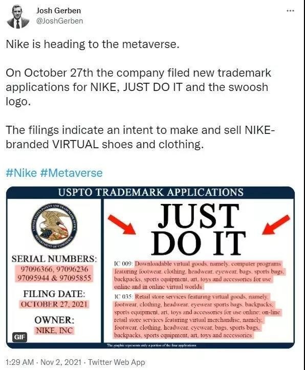 早在11月3日,耐克已向美國專利及商標局提交「NIKE」、「Just Do It」等多項商標申請,商標用途表示可用於下載虛擬物品,包括具有電腦編程特性的鞋、衣服、頭飾等產品。