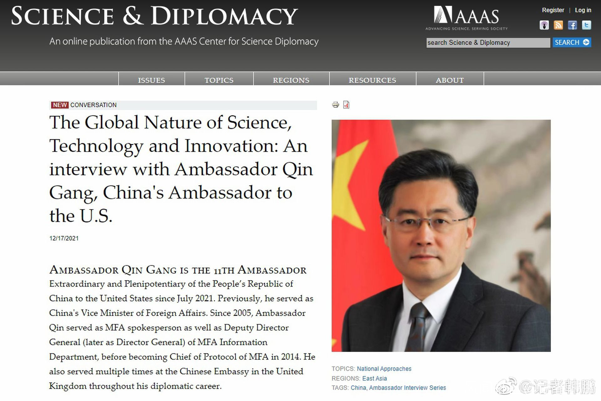 1、採訪秦剛大使的美媒,是《科學與外交》雜誌。採訪後,不同於其他美媒那樣一提中國就陰陽怪氣、斷章取義,該雜誌原原本本、忠實記錄,將採訪以一問一答的方式,英文全文呈現給讀者。