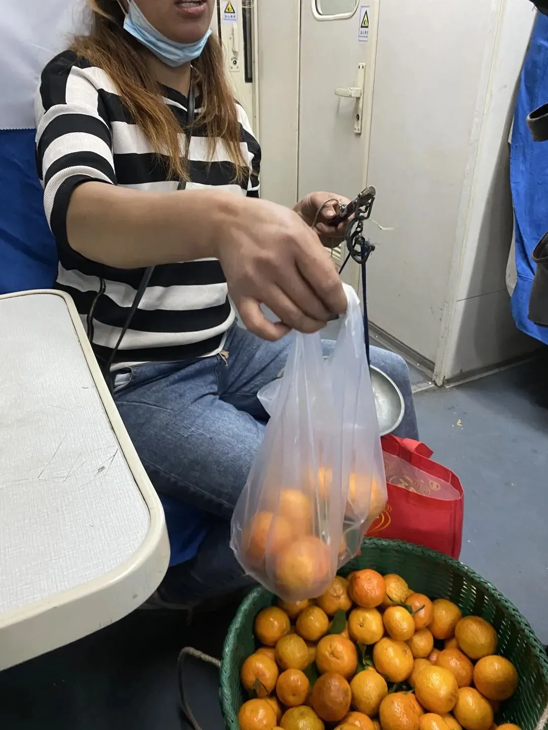 姐姐劉虹賣柑子,妹妹劉霞賣枇杷。沿着車廂從頭走到尾,也不用專門吆喝,想吃水果的乘客自己也就湊上來問東問西了。