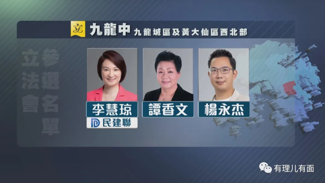 我們來看看她這次參選的議席,是立法會九龍中選區,她的主要競爭對手是香港最大建制派政黨民建聯的主席李慧瓊,同時李慧瓊還是全國政協委員。另外一位對手也是建制派成員楊永傑。