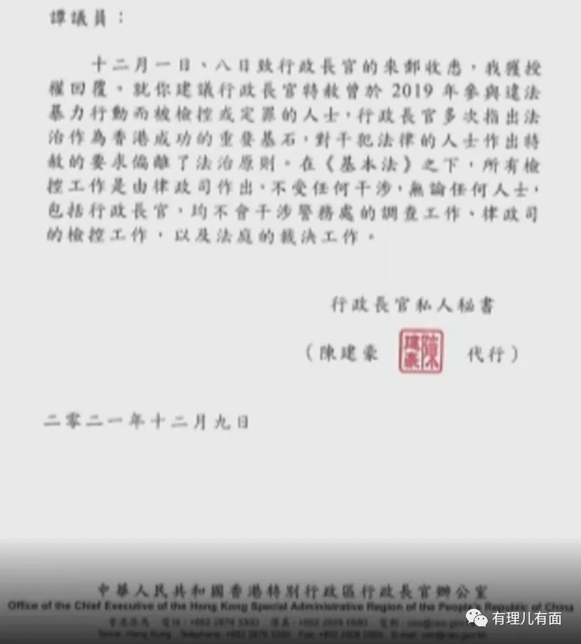 特首的回覆明確抓着法治問題打臉“三姓家奴”:亂港派一邊喊着要法治,你卻一邊要我利用特權做違反法治的事情,這事符合美國領事館給你們定的“普世價值”嗎?