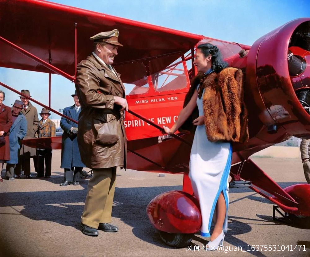 1939年美國著名的飛行家羅斯科.特納(左)捐贈給她和李霞卿一駕飛機用於在美國的抗日募捐、環美飛行活動,這是捐贈儀式上的一幕。