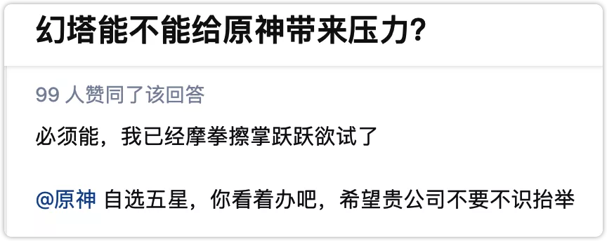 各大社交媒體上,《原神》玩家常常在評論區為《幻塔》助威吶喊,意在“希望《幻塔》能給《原神》壓力”。這一説法的靈感源自同行,據説《英雄聯盟手遊》國服上線時,就曾有別家MOBA遊戲出於競爭壓力發放福利。