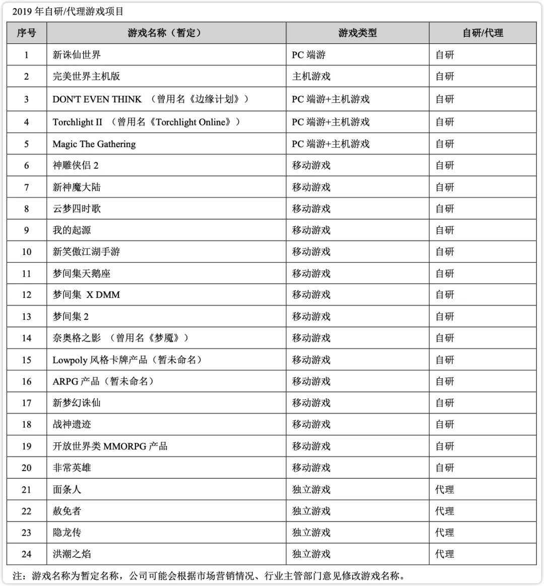 年報中的自研/代理遊戲項目列表