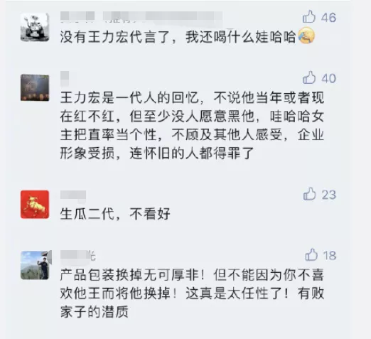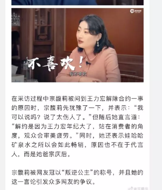 之前哇哈哈家接班人宗馥莉直言王力宏太老了,不但她不喜歡,觀眾也會審美疲勞。最後力排眾議把代言人王力宏給換掉了。