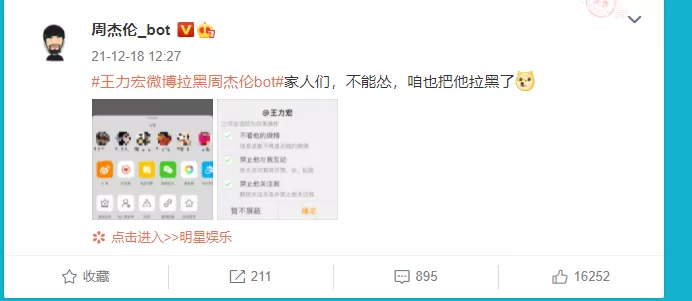 過了一個多小時,微博博主@周杰倫bot發現自己被王力宏拉黑了: