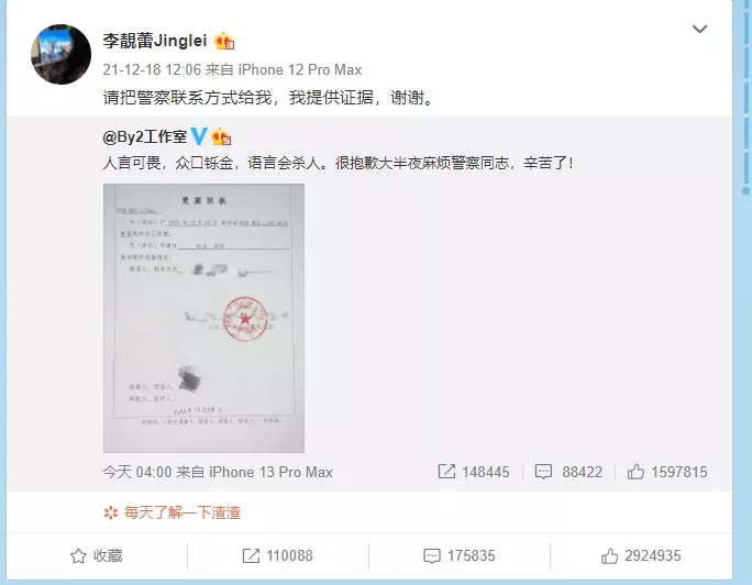 然而今天,BY2工作室曬出了一張報警單,表示網上説的都是謠言,他們已經報警: