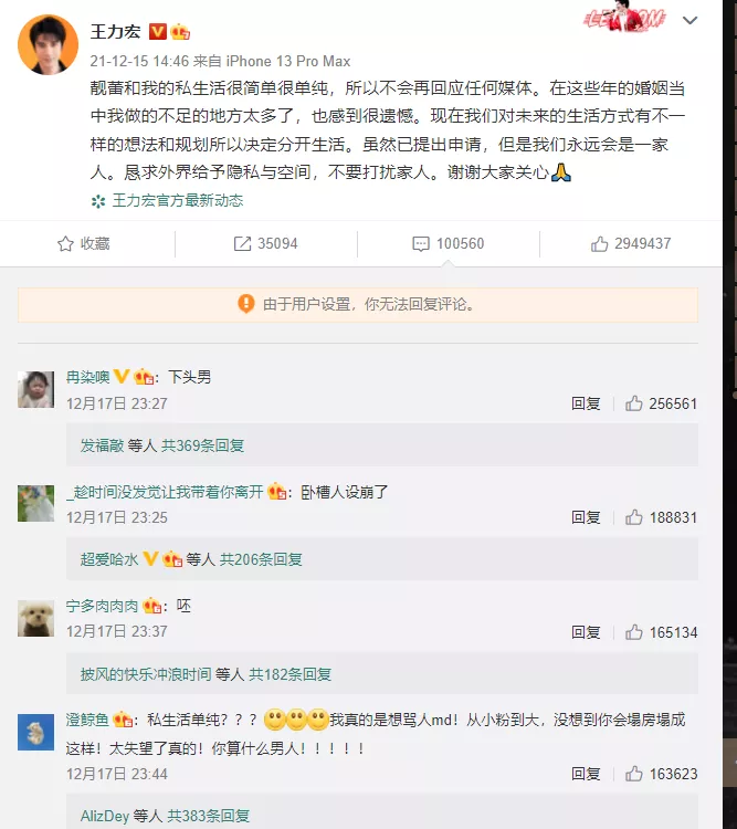該文發出引起軒然大波,導致王力宏一夜之間從“優質偶像”成為人人喊打的渣男。現在去王力宏的微博下面,會發現評論全部都是在罵他的: