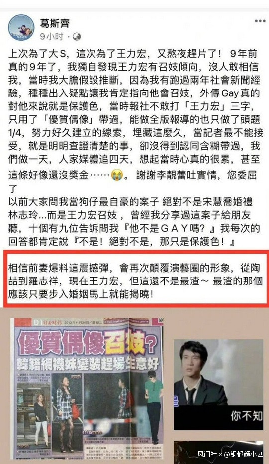 新聞記者發文稱:“真的9年了,我獨自發現王力宏有召妓傾向,沒人敢相信我,當時我大膽假設推斷,因為我有跑過兩年社會新聞經驗,種種岀入疑點讓我肯定指向他會召妓,當時報社不敢打‘王力宏’三字,只用了‘優質偶像’帶過,……謝謝李靚蕾吐實情,您委屈了”。一段污案,終於水落石出。