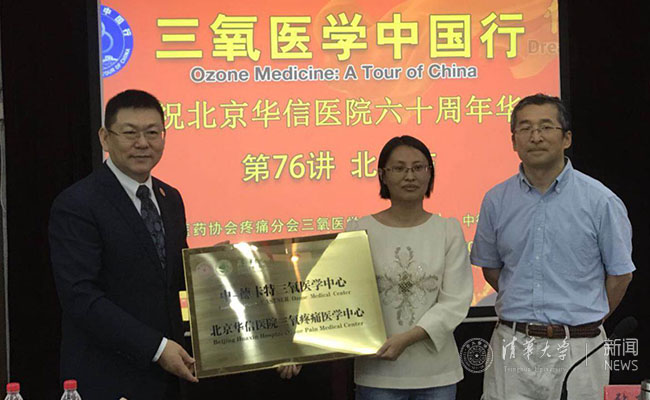 安建雄(左1)為清華大學第一附屬醫院(北京華信醫院)三氧疼痛醫學中心授牌(圖片來自醫院官網)