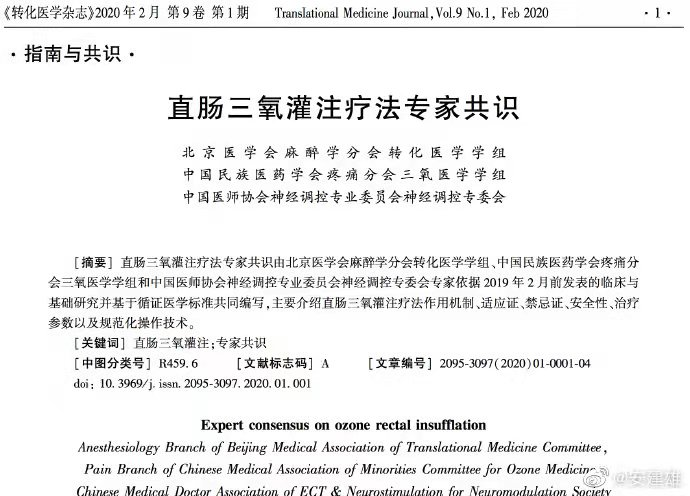 2019年12月,國家衞生健康委辦公廳印發關於“麻醉科醫療服務能力建設指南(試行)的通知”,在附件3《麻醉關鍵技術目錄》中的“麻醉與疼痛治療技術”列表中,“三氧注射術”和“三氧自體血療法”也赫然在列。