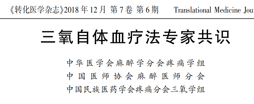 2018年,中華醫學會麻醉學分會疼痛學組,中國醫師協會麻醉醫師分會、中國民族醫藥學會疼痛分會三氧學組相關專家聯合制定了《三氧自體血療法專家共識》。“共識”根據循證醫學,參考美國預防服務工作組及牛津循證醫學中心疾病證據等級制定方法,將三氧療法治療的疾病證據等級分為4類,有A級證據(有良好的科學證據證實臨牀益處遠超過潛在的風險)的適應證為無。