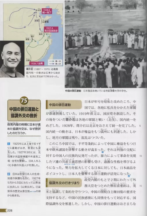(同前文提到的日本歷史課本,將九·一八事變的最終爆發歸咎於中國人損害了在華日本人的利益和日本軍閥關東軍出於“保護國民利益”目的的自行其是)