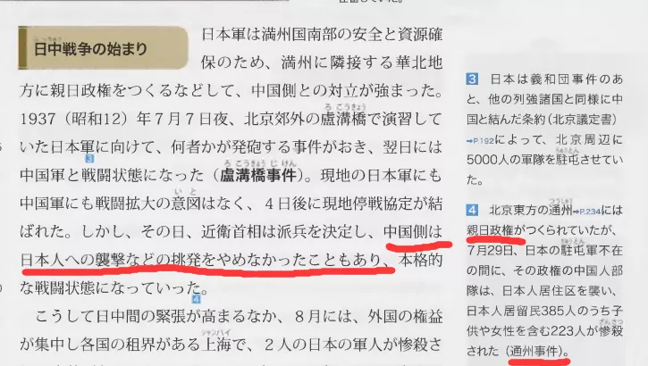 (在日本的歷史教科書中,不僅反覆強調是中國軍隊在“挑釁”日軍,還將所謂偽軍起義搗毀偽政權,消滅日偽軍和日本浪人的“通州事件”渲染為針對日本僑民的慘殺,將自己偽裝成受害者)
