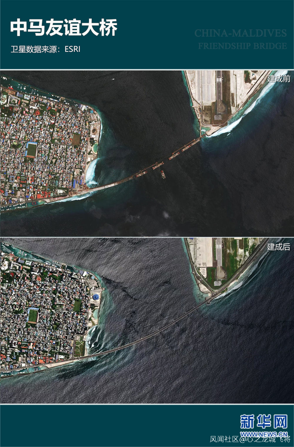 從衞星圖上看,中馬友誼大橋好似一根扁擔挑起了兩端的馬累島和機場島。作為馬爾代夫有史以來第一座大橋,同時也是印度洋上第一座跨海大橋,當地百姓和赴馬遊客可通過大橋5分鐘內往返於馬累島和機場島之間。