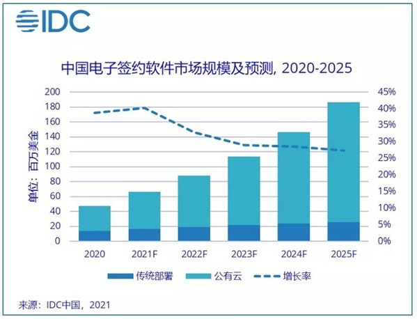 深圳2021年12月20日 /美通社/ -- 日前,IDC(國際數據公司)發佈《2020年中國電子簽名軟件市場份額》。報告認為,2020 年是電子簽名產品快速普及的一年,在機遇空前的大背景下,中國電子簽名軟件市場規模為 US$ 47.3M,同比增長 38.7%。其中,法大大以 26.4%的市場佔比排在第一位,較2019年增長37.2%,這也是法大大連續兩年登榜第一。此外,IDC預測至2025年,中國電子簽名軟件市場規模將達 US$186.4M,較2020年增長294%。
