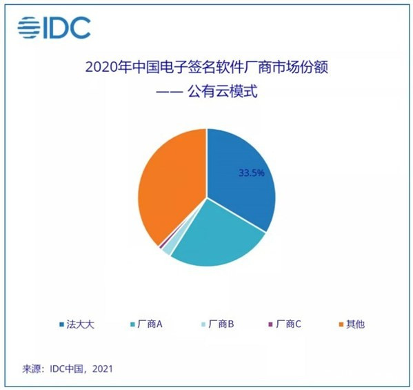 IDC認為,從增速更高的公有云市場來看,市場格局相對集中,前兩名廠商合計佔比接近60%,頭部優勢逐步顯現。而法大大布局公有云服務較早,並在騰訊的多個平台展開全面合作,公有云業務進一步提高,2020年,法大大以 33.5%的公有云模式市場份額排名第一。