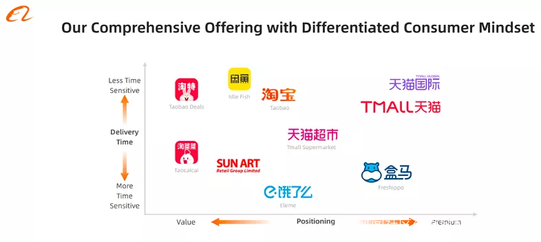 面向下沉市場,和手淘APP相比,淘特的獨佔會員DAU比例已接近50%;超過50%的淘菜菜用户第一次在淘系平台購買生鮮。針對多樣性、多場景需求,盒馬、餓了麼滿足了近場高頻剛需;淘寶、天貓既能滿足遠場剛需,也能滿足偶然性消費;閒魚則對二手交易需求做了重要補充。