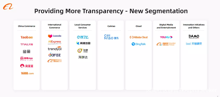 從集團的高度看,阿里巴巴的板塊治理的思路有更直接的呈現。本次投資者日,阿里巴巴集團首席財務官武衞表示,阿里巴巴將商業分部進一步拆分為“中國商業”、“跨境及全球商業”、“本地生活服務”、“菜鳥”四個部分,進一步提升公司透明度,反映業務最新進展。