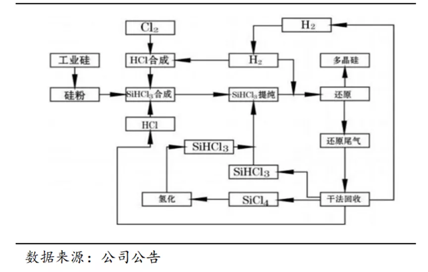 簡單來講,西門子法就是將工業硅粉汽化成三氯化硅SiHCl3,再進行提純,得出多晶硅的過程。由於製程上一直圍繞着三氯化硅展開,所以也可以叫其三氯化硅西門子法。