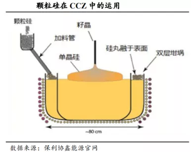 此外,在拉晶(從反應爐拉出來硅片)過程中,顆粒硅憑藉體積的優勢更適合於CCZ(連續直拉法),加料、 熔化、晶棒拉制同時進行,此過程極大地提升了生產效率。