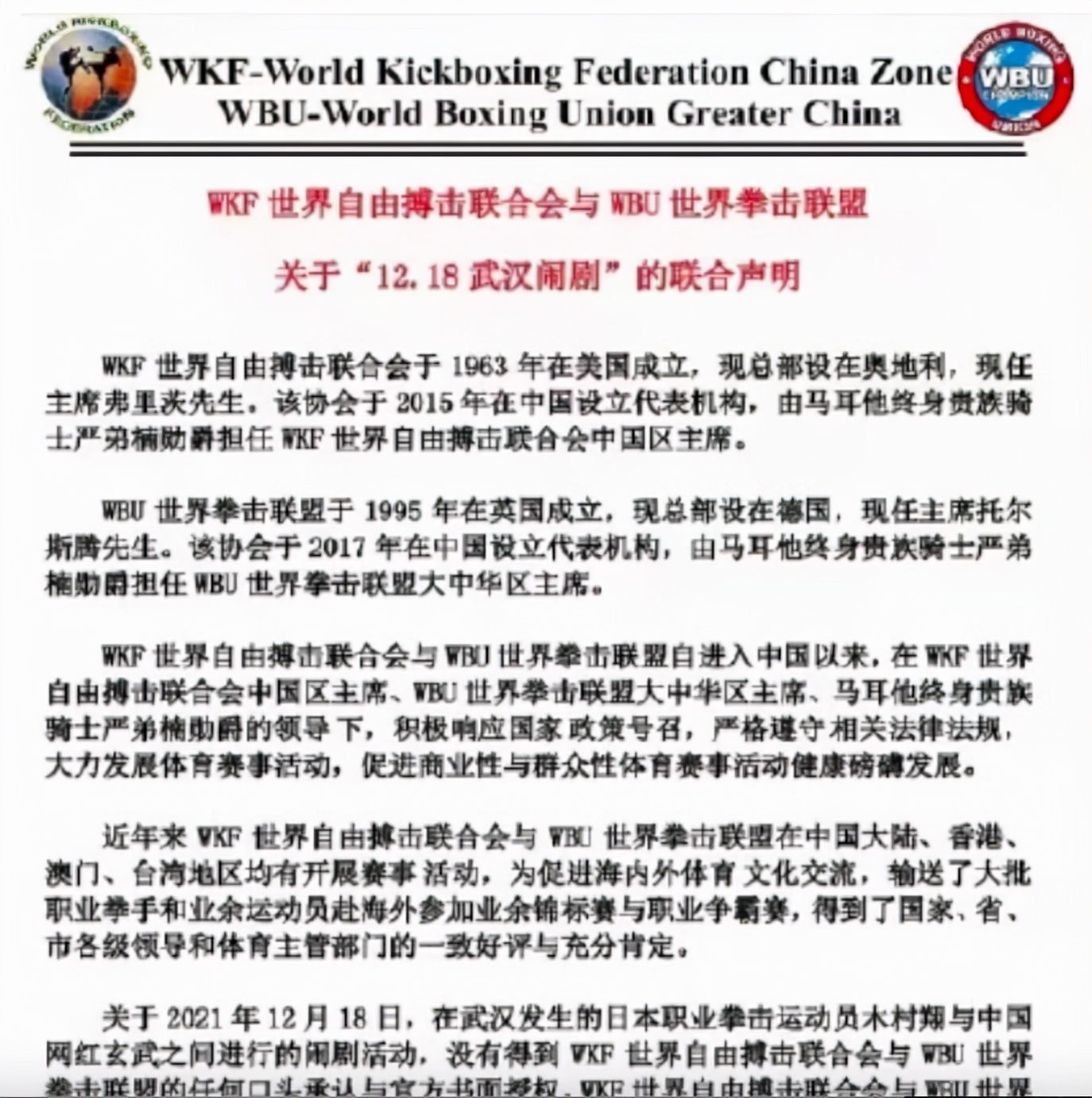 和我們WKF世界自由搏擊聯合會與WBU世界拳擊聯盟沒有任何關係!WKF和WBU將保留追訴其法律責任的權利。