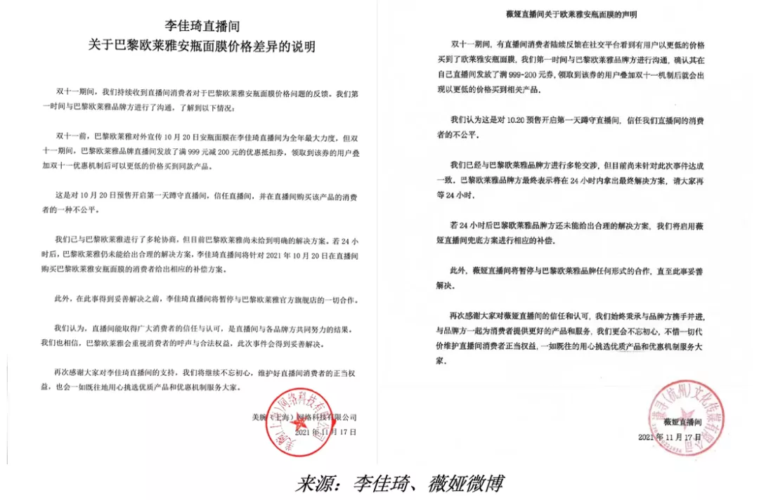 之所以有出入,是因為雙十一期間,歐萊雅品牌在自有直播間發放額外的滿減優惠券,所以在多重摺扣機制下,品牌直播間的價格比李佳琦和薇婭直播間價格低了170元,因而引發兩位主播直播間的消費者不滿和投訴。11月17日晚,兩位主播表示,歐萊雅擅自派發優惠的行為違反此前合作協定,並分別發佈聲明,暫停與歐萊雅官方旗艦店的一切合作。