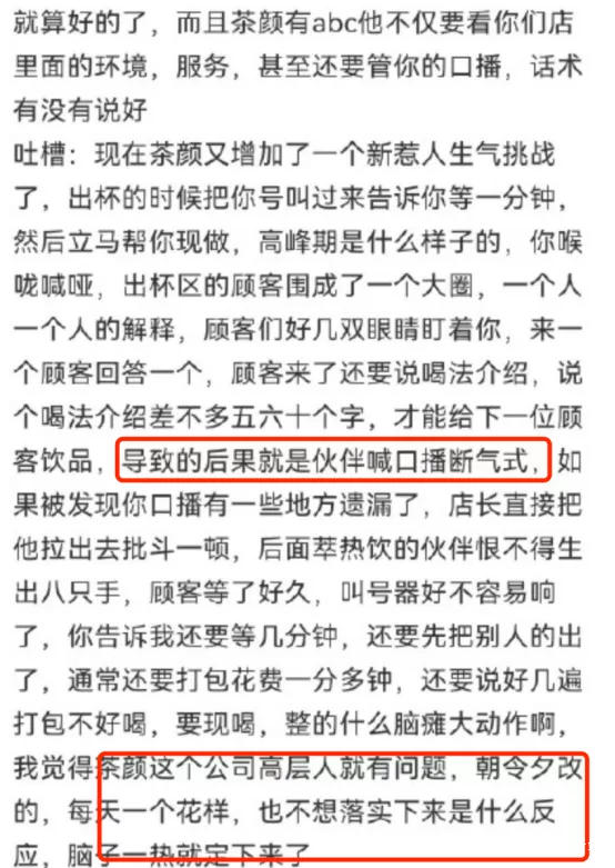 也有一些員工直指茶顏悦色門店經營問題:稱“大喊大叫”的口播要“煩死顧客”了,也讓員工快“喊斷氣”了,而反映到高層,“就只會裝死”。而高層的決策“朝令夕改,每天一個花樣,也不想落實下來是什麼反映,腦子一熱就定下來了。”