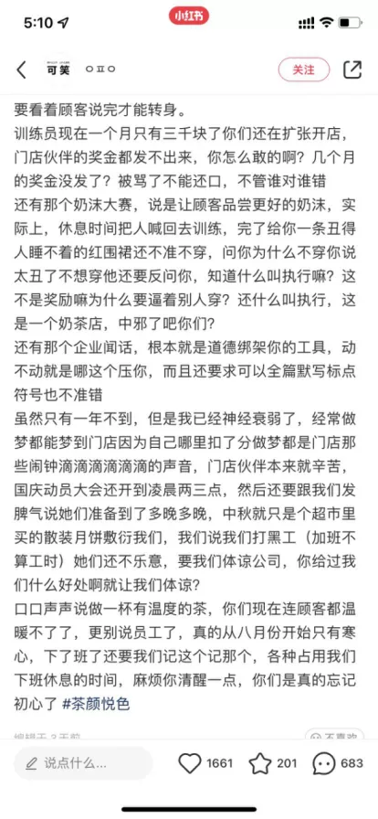 有基層員工在小紅書發小作文:“再見,茶顏。”並吐槽茶顏“不把員工當人看”,開會開到凌晨3點,加班不算工時等問題。