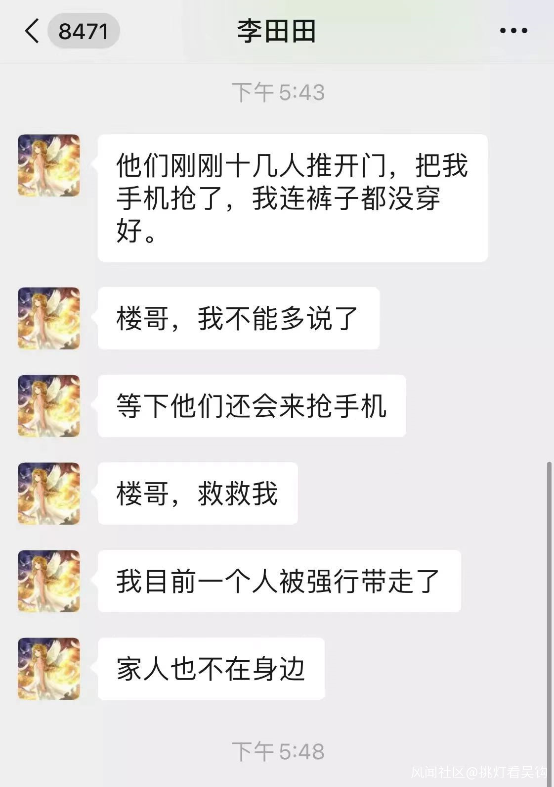 下午,教育局非要把李田田強行帶去醫院住院治療。李田田對外發出了信息:十幾個人闖入她的卧室,已經把她強行帶走了,甚至都沒讓她穿好褲子。最後被抓走關進精神病院,她藏了一個手機在內褲裏,向外界再次發出了求救信息……