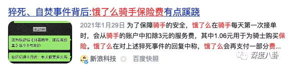 比如今年初,1月份,43歲的餓了麼騎手猝死後,被發現了他每天繳納的保險費疑似被剋扣引發風波。