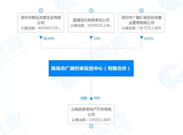 比如,珠海市廣融恆泰投資中心(有限合夥)。天眼查顯示,它由深圳朗泓浩星、國通信託、深圳廣融匯股基金分別持股80.99%、19%、0.01%,疑似實際控制人為葉遠西。對外投資的雲南良黎房地產開發有限公司,負責改造恒大珺睿項目。
