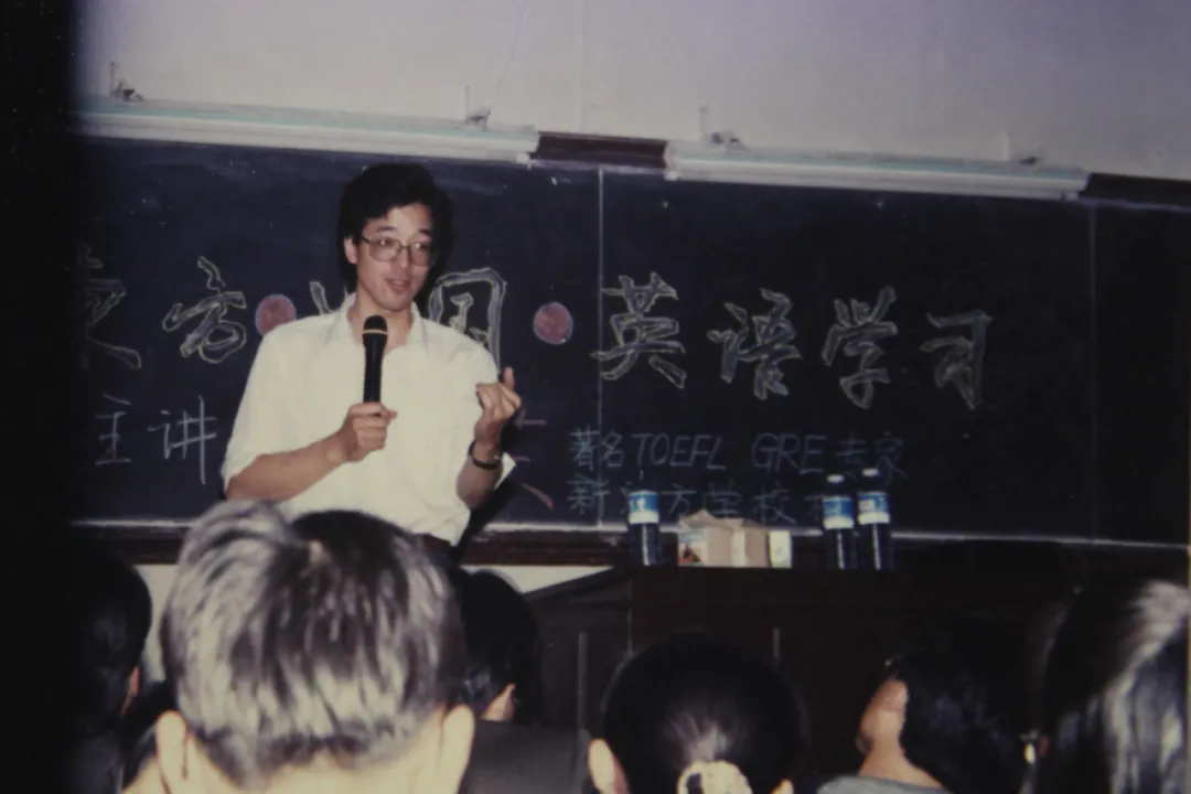 俞敏洪為更多出國留學的人“造夢”。圖為上世紀90年代俞敏洪在課堂上