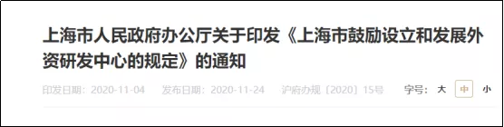 2020年11月2日,上海市政府辦又下發《上海市鼓勵設立和發展外資研發中心的規定》,繼續釋放税收、土地、補貼、人才引進等多方面的優惠。