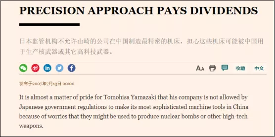 2007年7月13日,英國《金融時報》發佈了一則新聞《山崎的“中國夢”》,文中寫道:“日本政府監管機構不允許他的公司(山崎馬紮克)在中國製造最精密的機牀,擔心這些機牀可能被中國用於生產核武器或其他高科技武器。”