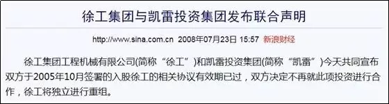 商務部沒有否決,但是這份合同被拖了一年半也沒能執行。2008年7月,由於協議期已過,徐工集團和凱雷投資發佈聯合聲明,終止合作。