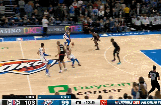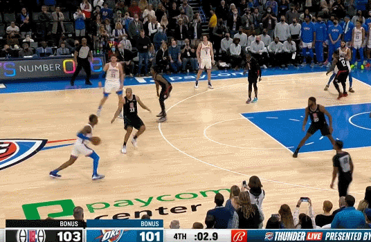 亞歷山大後場接球,他並沒有撒開他的大長腿全力狂奔,好像並不知道時間緊急似的。中速過半場,停一下觀察一下局勢和防守人,快船小陣容而且都在防三分,他一個體前變向接換手過掉温斯洛。
