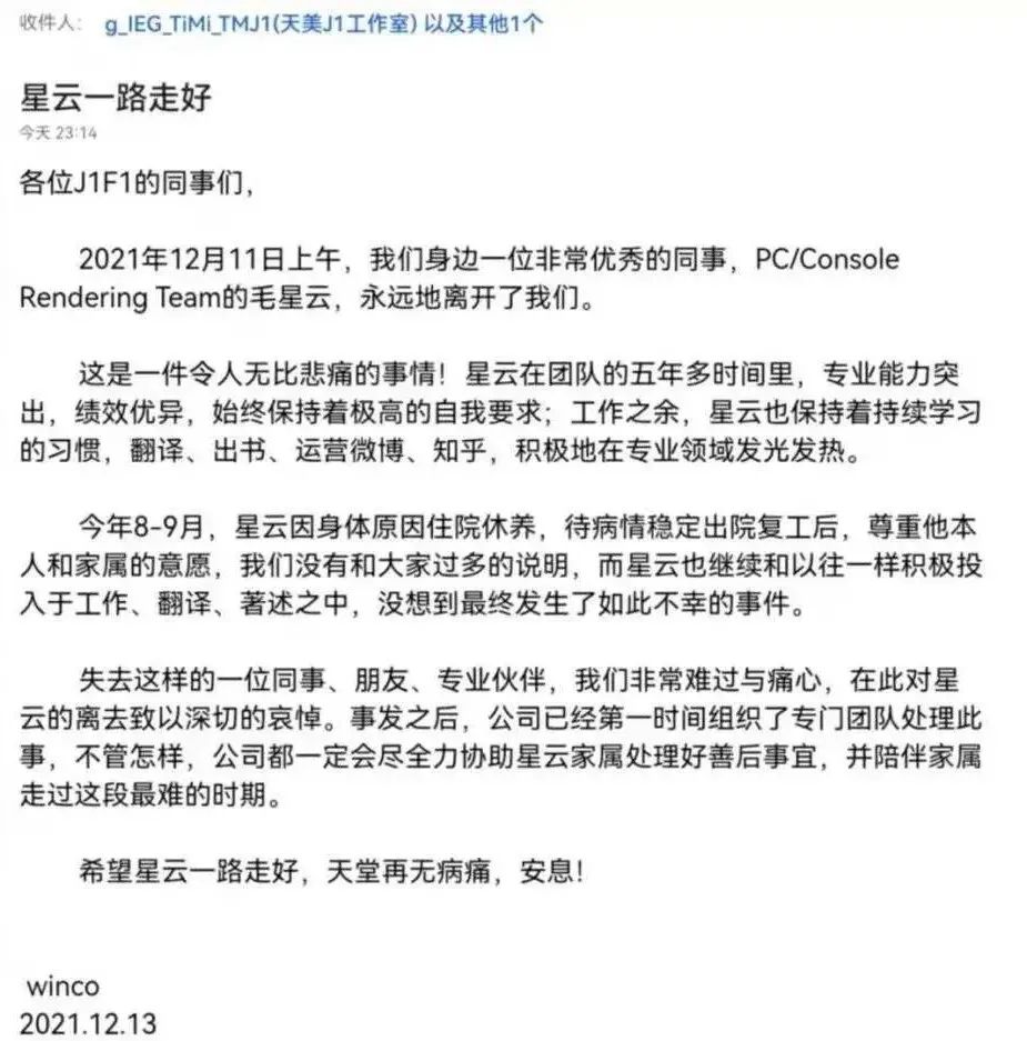 在那封“星雲一路走好”的信中,騰訊方面至少確認了一個消息,今年8-9月,毛星雲因身體原因住院休養,待病情穩定出院復工後,尊重他本人和家屬的意願,公司沒有做過多的説明,而毛星雲也繼續積極地投入工作。