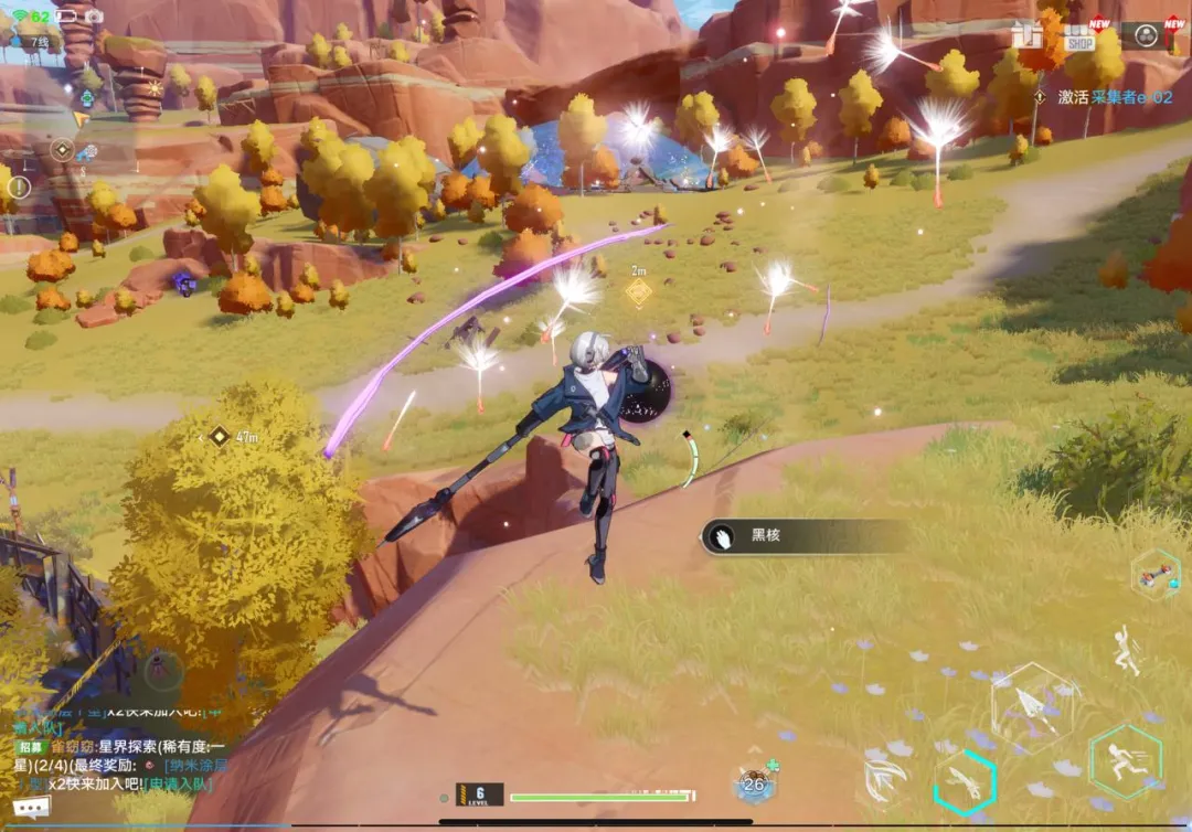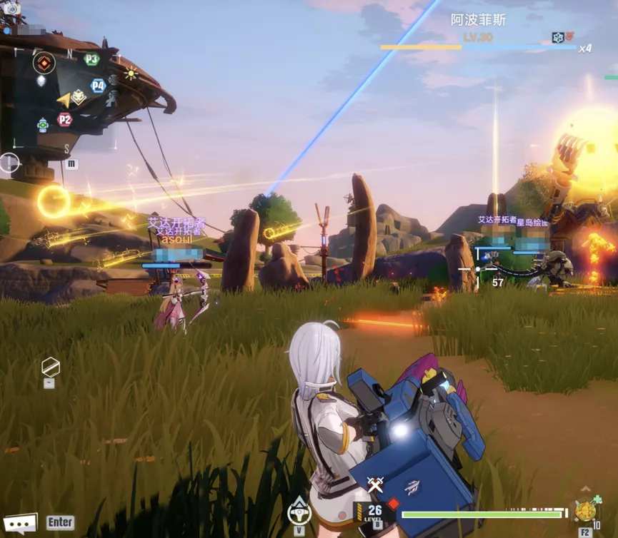 另外,《幻塔》的戰鬥也不止是玩家自己的武器和操作。除了利用草叢背刺怪物、用火箭點燃草地燒敵人這些基本的開放世界操作,遊戲中還有不少契合其科幻背景的場景道具:面對大量敵人時,可能會有個固定的機槍塔讓玩家上去掃射;當敵人會飛,也會有帶玩家上天享受空戰體驗的戰鬥機。