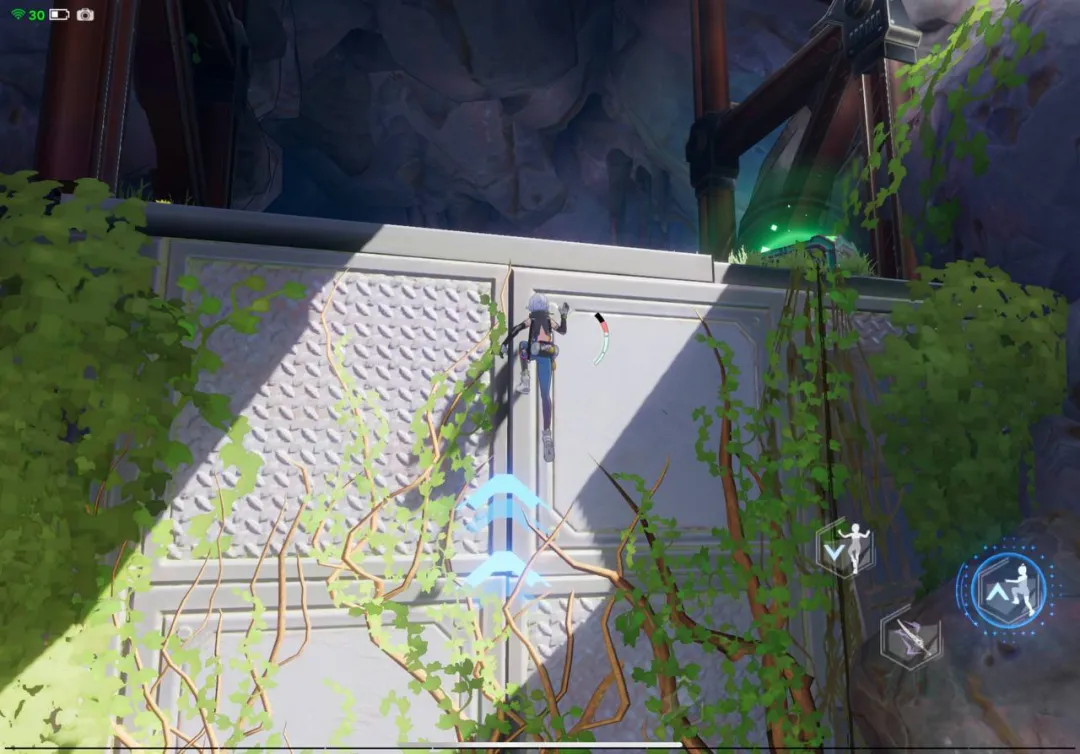 而在《幻塔》裏,這些問題全都不存在了。遊戲早期就提供了可以原地起飛的噴氣揹包,可以登上各種高處。落地前一個衝刺就可以避免摔死,也讓我很快就敢於到處亂飛。還有爬牆神器抓手,讓角色能飛檐走壁。以及在水中高速前進的滑板,讓溺死案件很難發生在《幻塔》裏。