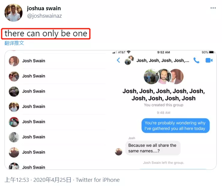 這個事情很簡單也很離譜,就是一羣重名的叫做 Josh 的人約好了地方打一架,因為只能有一個 Josh 。。。