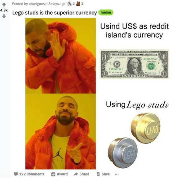 官方貨幣則是前段時間被捧起來的狗狗幣,也有説用樂高作為貨幣的。