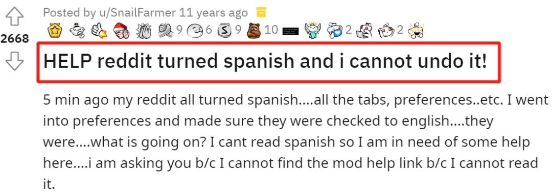 這上面缺啥都不缺各種各樣的沙雕帖子,比如早在 2010 年就有這麼一條帖子,説自己 Reddit 界面所有語言都變成西班牙語了,自己啥都看不懂。。。